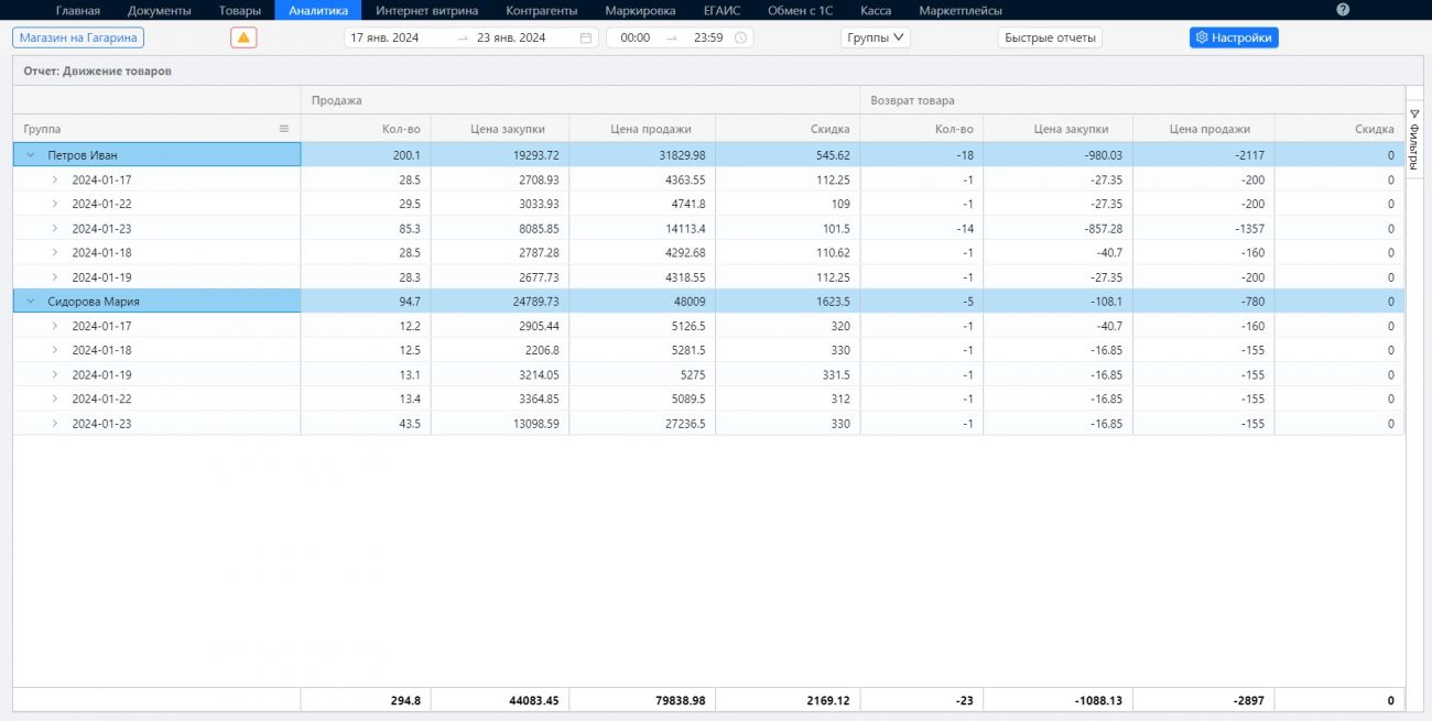 - Контролировать основные показатели и работу кассиров. С помощью отчётов следите в режиме онлайн за продажами, возвратами, выручкой по сотрудникам, товарными остатками, дублями, нулевыми ценами и позициями с низкой наценкой. Вы увидите в отчётах, какие товары пользуются спросом, а какие плохо продаются.